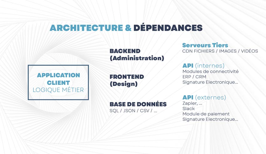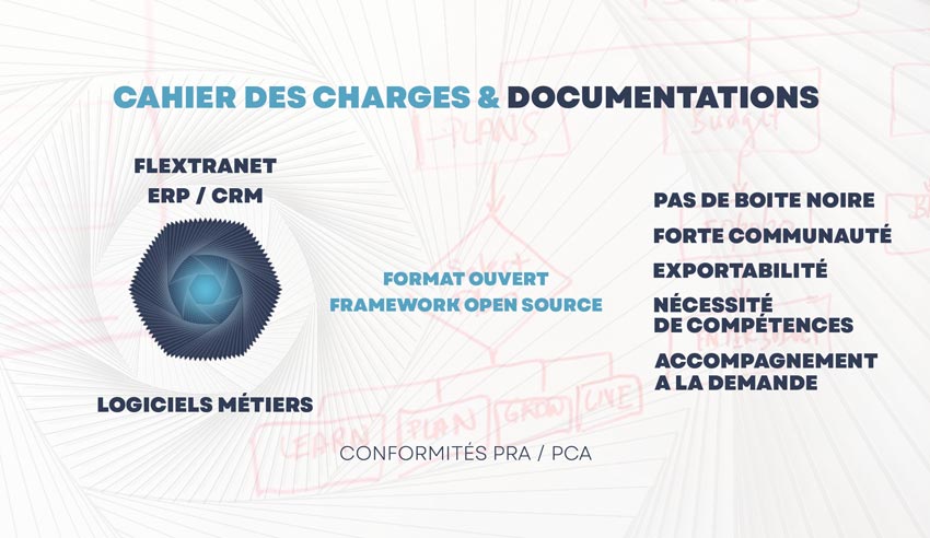 Permet de développer des applications complexes sur la base d’un cahier des charges précis (fonctionnalités, droits, workflow, connexion API, base de données, type d’utilisateurs, flux de documents, exigences sécuritaires, souveraineté, déploiement On Premise, Cloud, SAAS…)